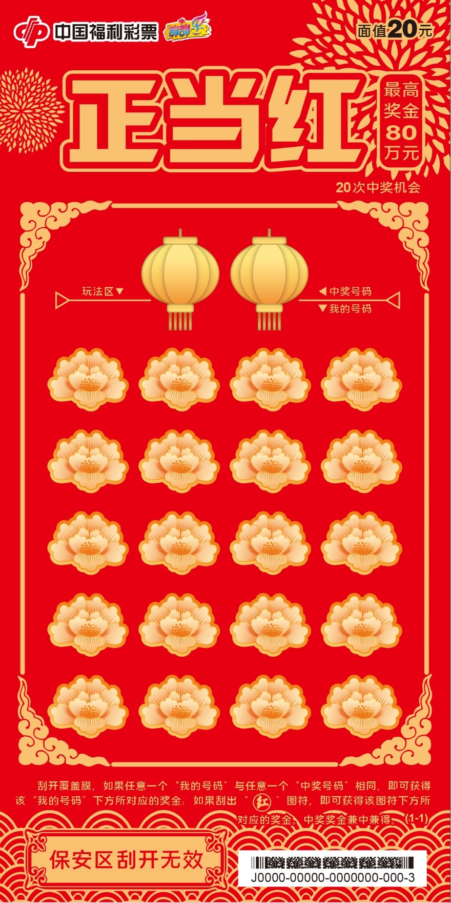 “正当红”象征着祖国经济繁荣昌盛,人们生活红红火火,幸福安康。票面以红色及金色为主色调,刮开区采用了象征富贵吉祥的牡丹花和富有质感的灯笼云纹等元素,代表着好运将至。整体票面寓意积极向上,代表了“中国正当红”的含义。“正当红20元”最高奖金80万元,采用了经典的“对数字”和特定图符玩法,共有20次中奖机会。